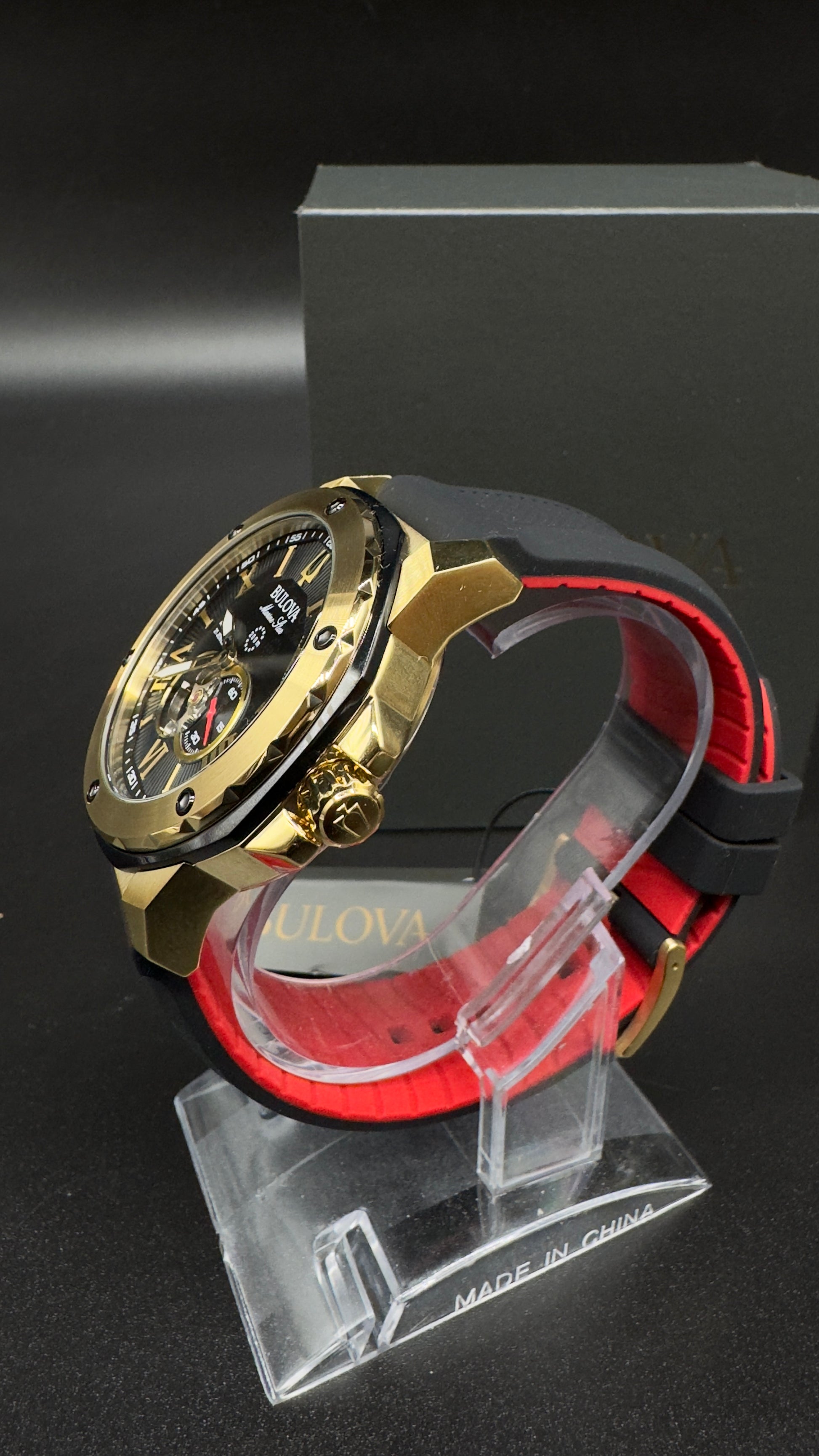 Gold-tone stainless steel case with a black (red underside) rubber strap. Fixed gold-tone bezel with a black bezel ring. Black dial with luminous gold-tone hands and Roman numeral hour markers. Arabic numeral minute markers (at 5-minute intervals). Minute markers around the outer rim. Dial Type: Analog. Luminescent hands. Small seconds subdials. Miyota caliber 82S5 automatic movement, containing 21 Jewels, bitting at 21600 vph, and has a power reserve of approximately 42 hours. Scratch-resistant mineral crystal. Transparent case back. Round case shape. Case size: 45 mm Case thickness: 13.45 mm. Band width: 24 mm. Tang clasp. Water resistant at 200 meters / 660 feet. Functions: hour, minute, small second. Marine Star Series. Casual watch style. Watch label: Japan Movt. Bulova Marine Star Automatic Black Dial Men's Watch 98A272.